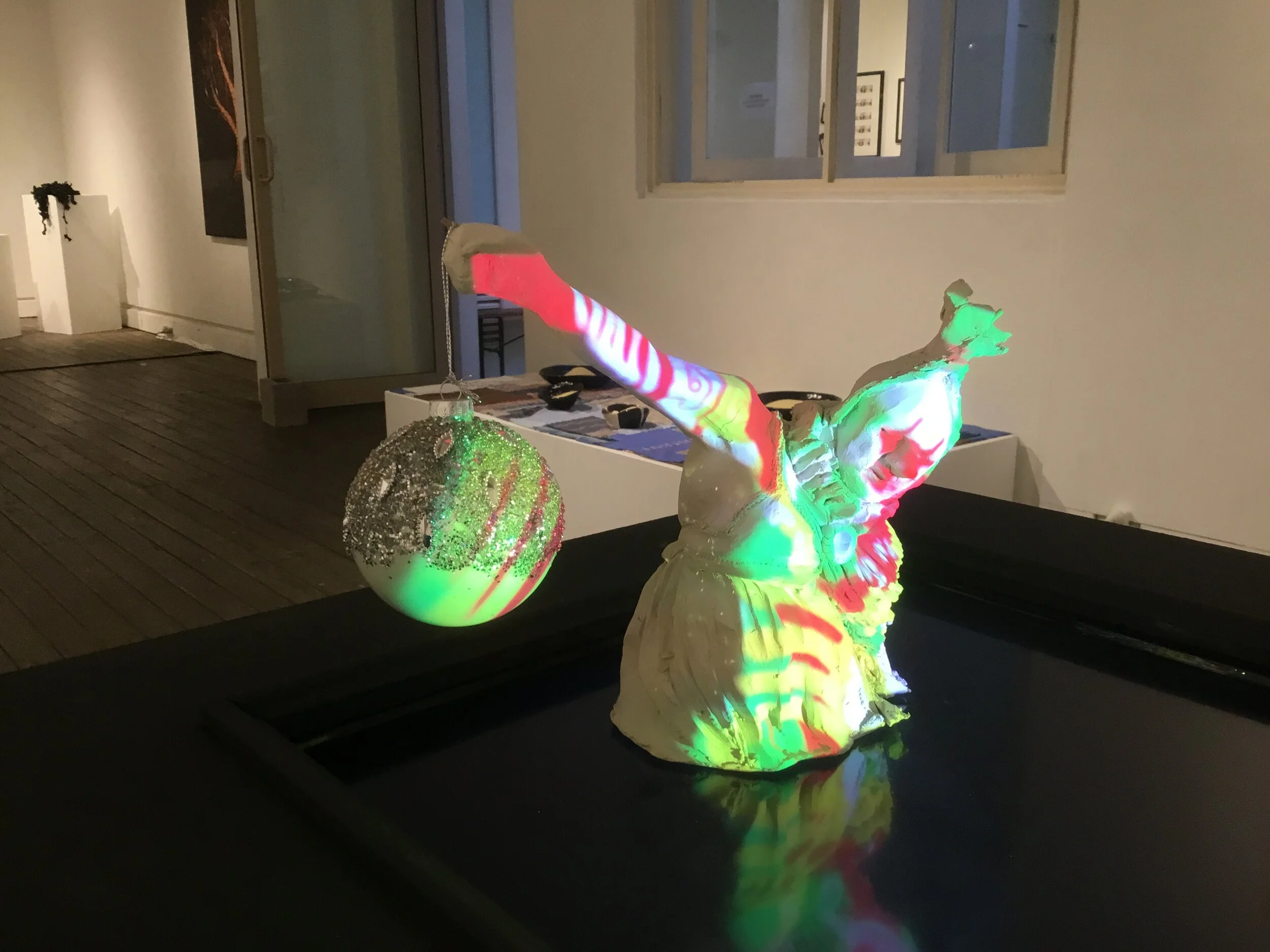 The Fool project was a experiment using the animation capabilities of time based digital drawing. The air dried clay sculpture of a female clown, was placed on an HD TV, placed in a painted black box made from found off cut wood. The animation projected on the screen below interacted with the sculpture, creating an aesthetic creating an environment, followed by a projection cast on the sculpture throwing colour onto the figure. The Work was the final work for the Masters of Fine Art coursework degree at UNSW Art & Design 2016